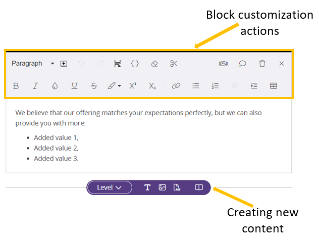 - Each block has a toolbar with a series of options for customization. Click here to view the full article : 'Options for graphic layout for text content'.