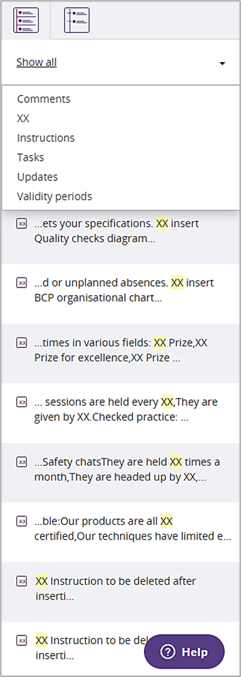 : lets you access specific actions (XX search, comments, collaborative work, instructions, etc.).