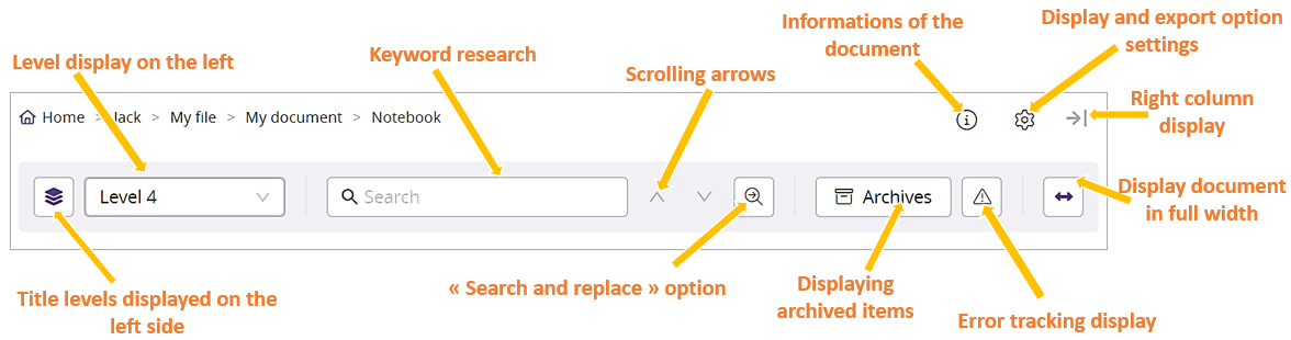 - Left-hand column: lets you access the menu, the search engine, the display options, the outline mode, and displays the document layout.