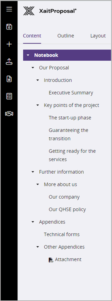 - The 3 tabs Content, Outline and Layout give you easy access to the commands in the central column: