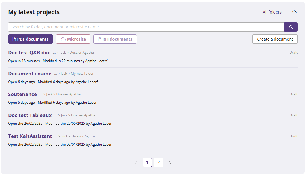 📌 The "My latests Projects" section allows you to access the most recent documents you've opened. A search bar helps you to find a specific document: the search looks for one or more words contained in the name or description of the document or its folder.