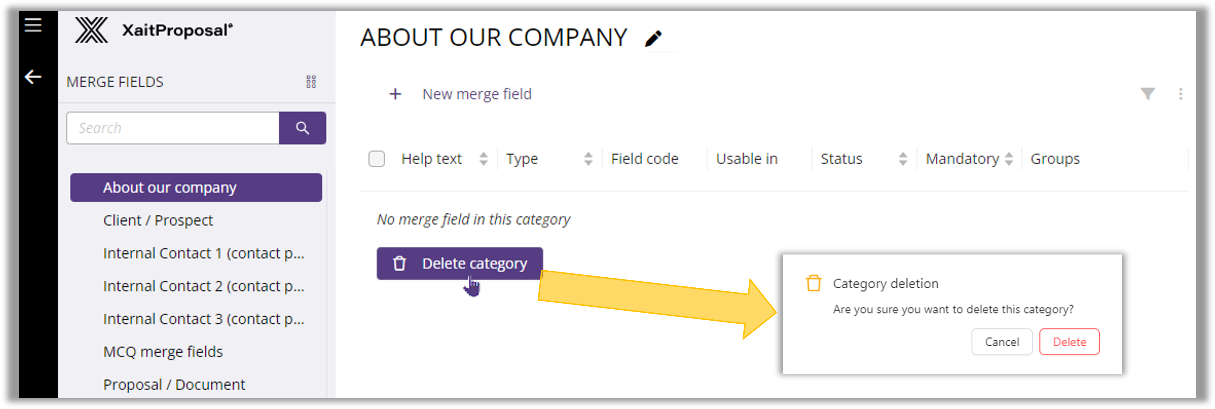 - You cannot delete a category that includes merge fields, even if they are archived.