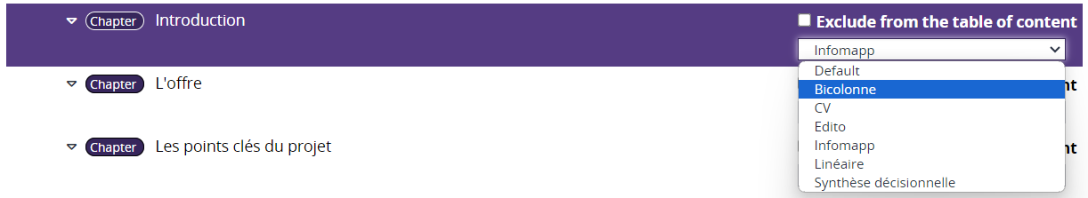 For example here, I have 7 templates available for this chapter. If I select the two-column template for the chapter 'The offer', the entire chapter will be presented as 2 columns:
