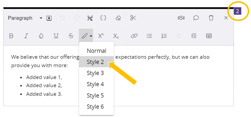 - Open the text block where you want to apply a style so that the toolbar appears.