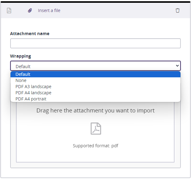 The wrapping for a PDF attachment lets you decide whether or not to apply a specific layout template for the PDF export of your document.