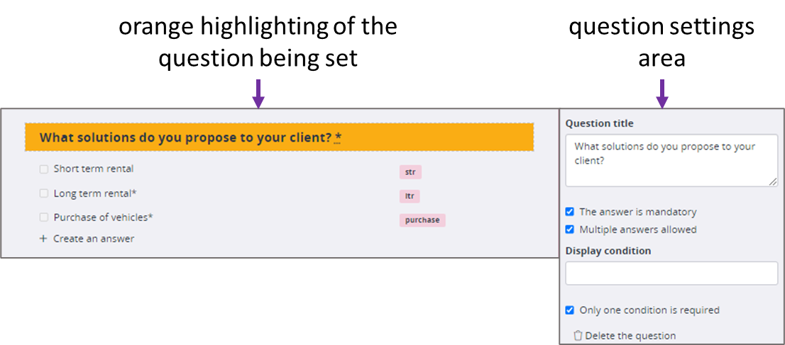 - The right-hand column is used to write questions and answers and set their parameters.