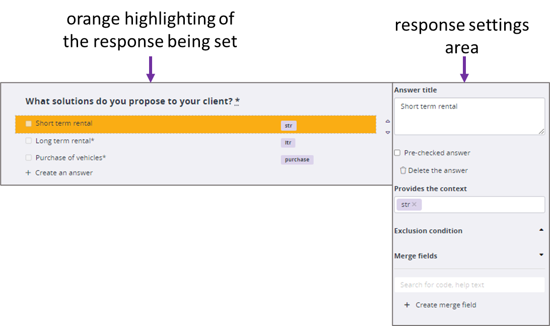 - To create a new answer, click on 'Create an answer' under the last question in the central section.