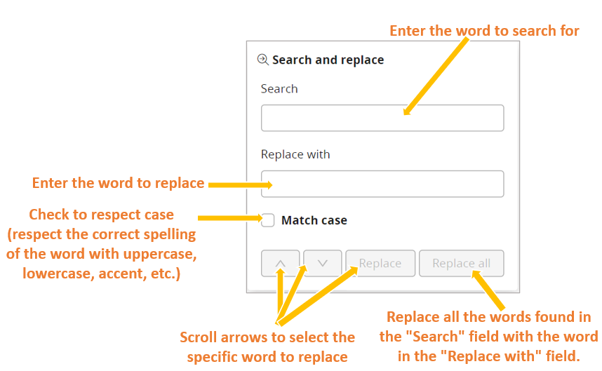 This feature allows you to replace in one time a word (or group of words) that has been repeated several times in your document. For instance, this allows you to search for XX and customize them, or to search for and replace a misspelled word that is repeated several times.