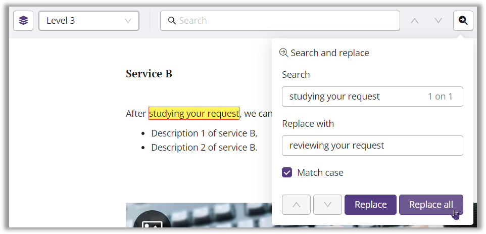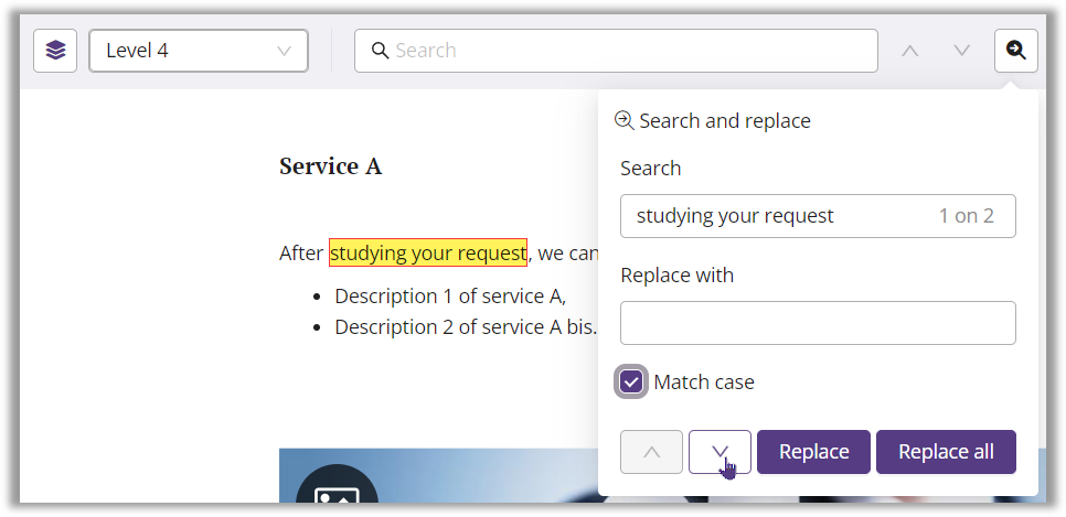 - Replace, to replace the selected occurrence of your search. You can then proceed with the following results, one at a time.