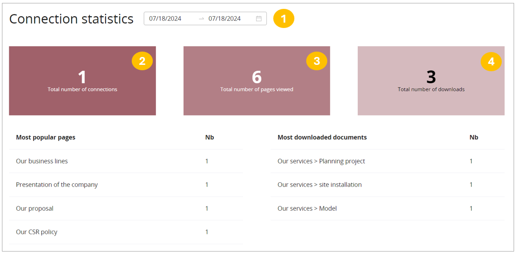 NB: One user connecting to the mini-site is equivalent to one connection per day (even if the user connects to the mini-site several times). However, if the same user reconnects 24 hours later, this counts as a second connection.