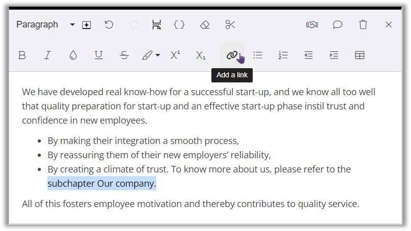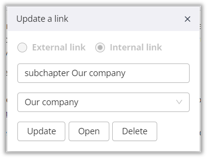 To modify, open or delete an internal link, click on it in the paragraph block.