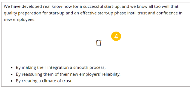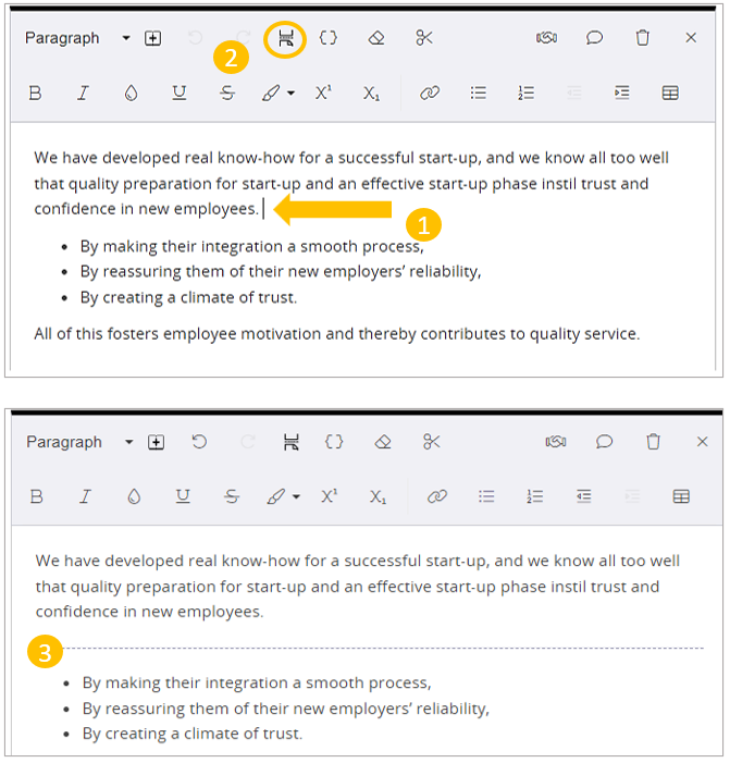 - Click 'Save': the paragraph has now been divided in two and the page break inserted is visible as a dotted line between the two paragraphs.
