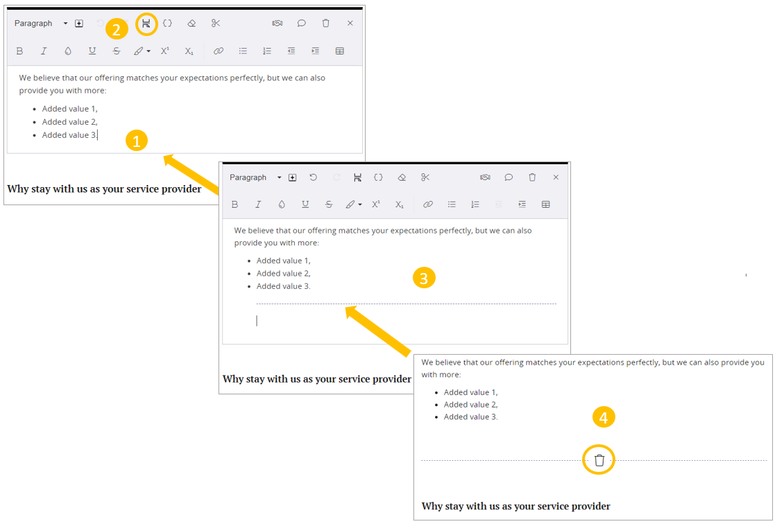 - In the toolbar, click on the 'Page break' button: a line appears where the cursor was positioned.