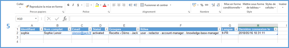 The table displays one row per account and lists all the information contained in the user file. It also tells you if the account is active or not (column D) and when the user last logged in (column H).