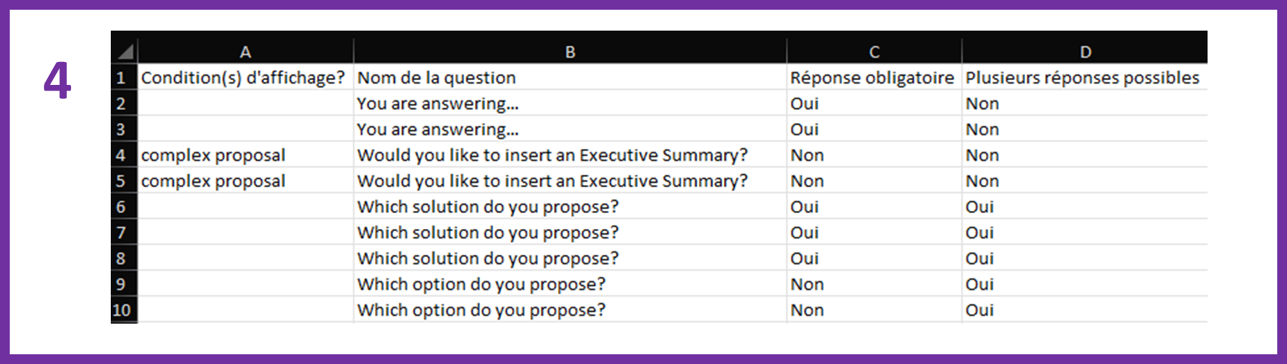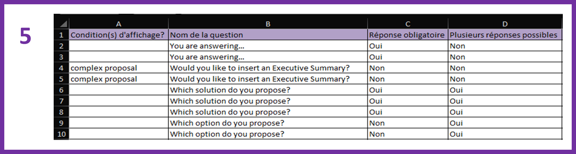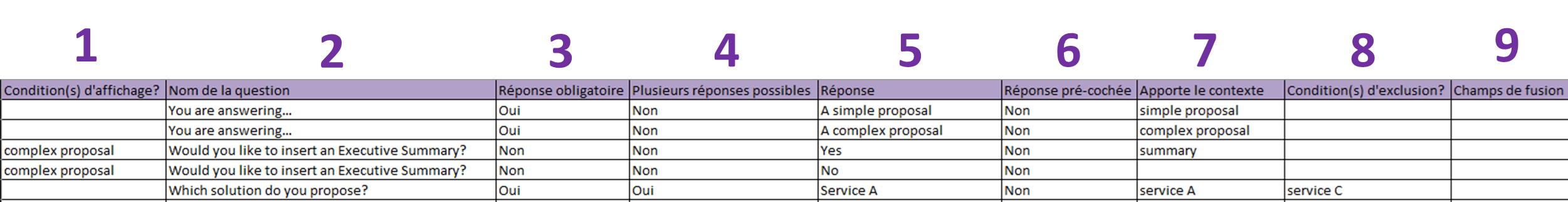 NB: The table displays one line per answer. The questions and their properties (compulsory question, several possible answers) are therefore, by default, repeated as many times as they contain questions.