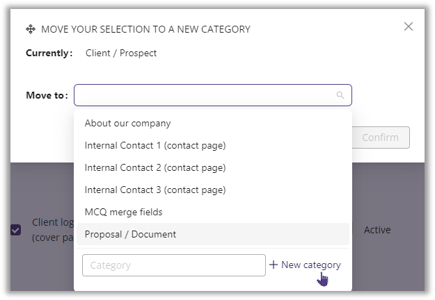 You can also create a new category using the dedicated field below : enter a name and click on "+ New category". - Click "Confirm".
