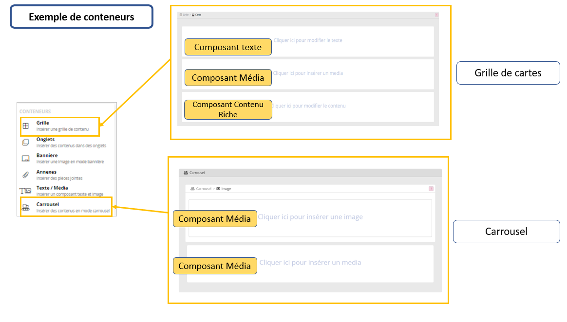Ici, 3 composants simples sont regroupés dans le contenant Grille de cartes. Ces composants sont tous optionnels, vous pouvez très bien décider de mettre juste un titre et un média.