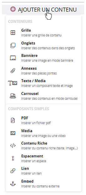 - Le composant simple : c’est un mono-contenu qui peut être utilisé seul ou assemblé dans un conteneur avec d’autres composants.