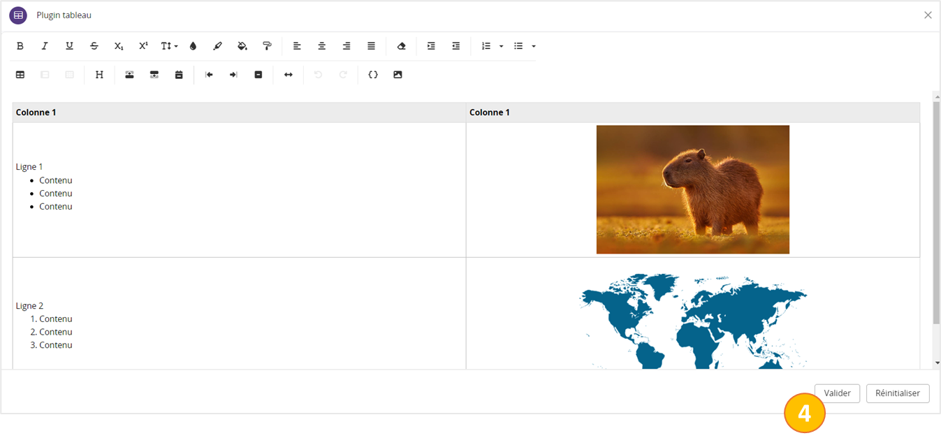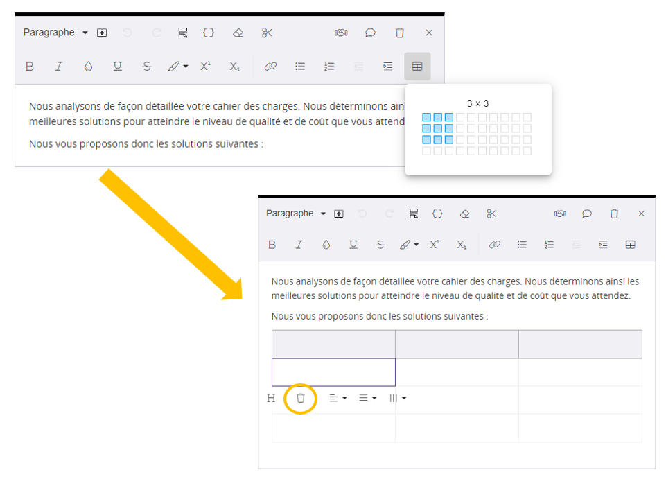 Vous pouvez créer des tableaux dans les blocs paragraphes de textes.