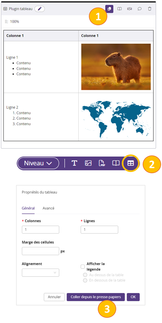 - Le Plugin Tableau s'ouvre. Dans les propriétés du tableau, cliquez sur "Coller depuis le presse papier"