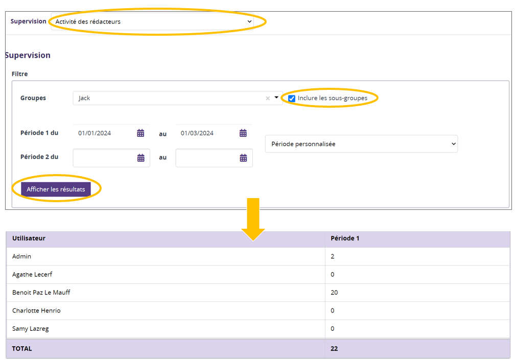 - Un tableau s'affiche avec tous les utilisateurs et le nombre de documents réalisés par utilisateur.