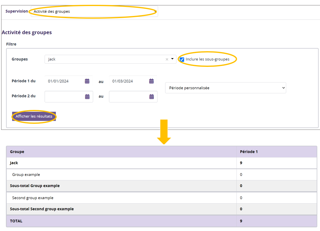 - Un tableau s'affiche avec tous les groupes (et sous-groupes si coché) et le nombre de documents réalisés par groupe.