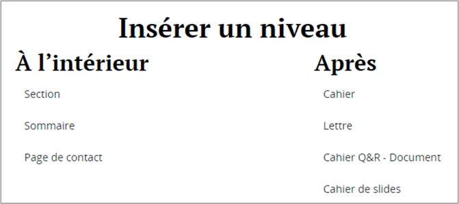 - Sélectionner le niveau concerné par l'insertion (Cahier, Section, Chapitre, Sous-chapitre...).