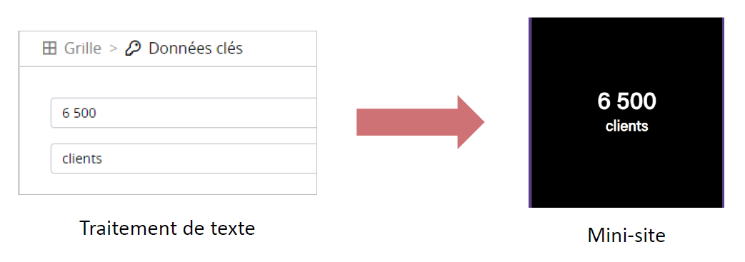 La donnée clé permet de mettre en valeur des informations / chiffres dans votre mini-site. Elle est composée de 2 champs texte simple qui seront mis en forme avec la 1ère donnée en 'gros' et la 2nde en plus petite. Ce composant ne peut être utilisé seul, il est uniquement disponible via le conteneur 'Grille'.