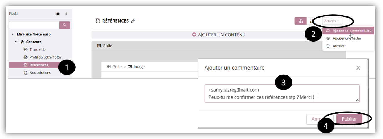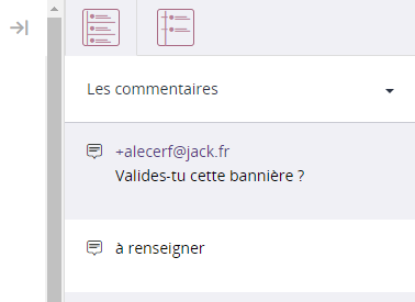 Les commentaires permettent d'annoter un master Web / mini-site, ou d'interpeller un utilisateur du même groupe.