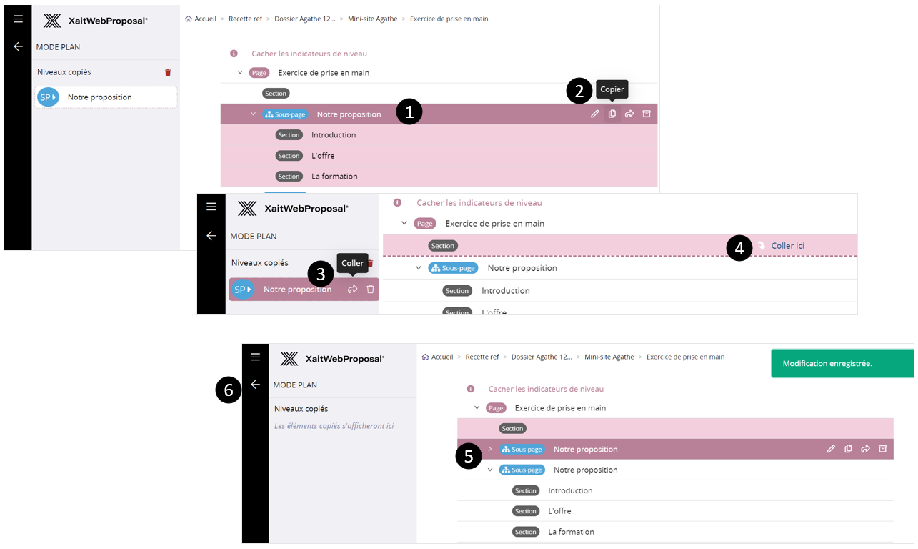- Si je copie un niveau page, sous-page ou section, tous les niveaux inférieurs sont également copiés puis collés.