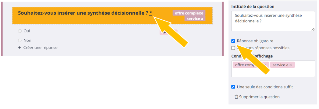 Par exemple ici, la question 'Souhaitez-vous insérer une synthèse décisionnelle ?' apparaîtra uniquement si j'ai coché 'Offre complexe' à la question précédente.
