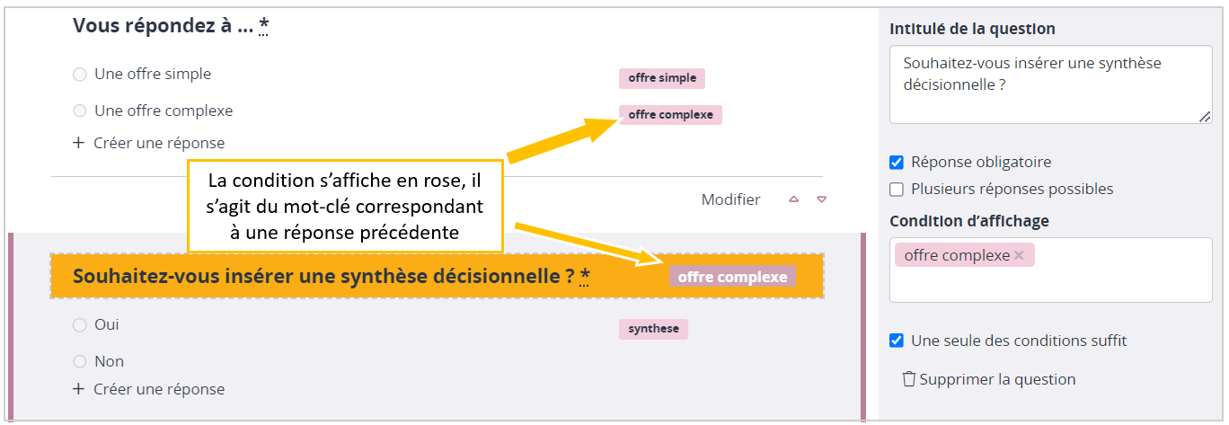 - Tapez le mot-clé (contexte réponse) dans le champs 'Condition d'affichage' puis 'Entrée'.