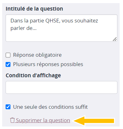 - Une seule des conditions suffit : cette question apparaît-elle si une ou plusieurs conditions sont cochées ?