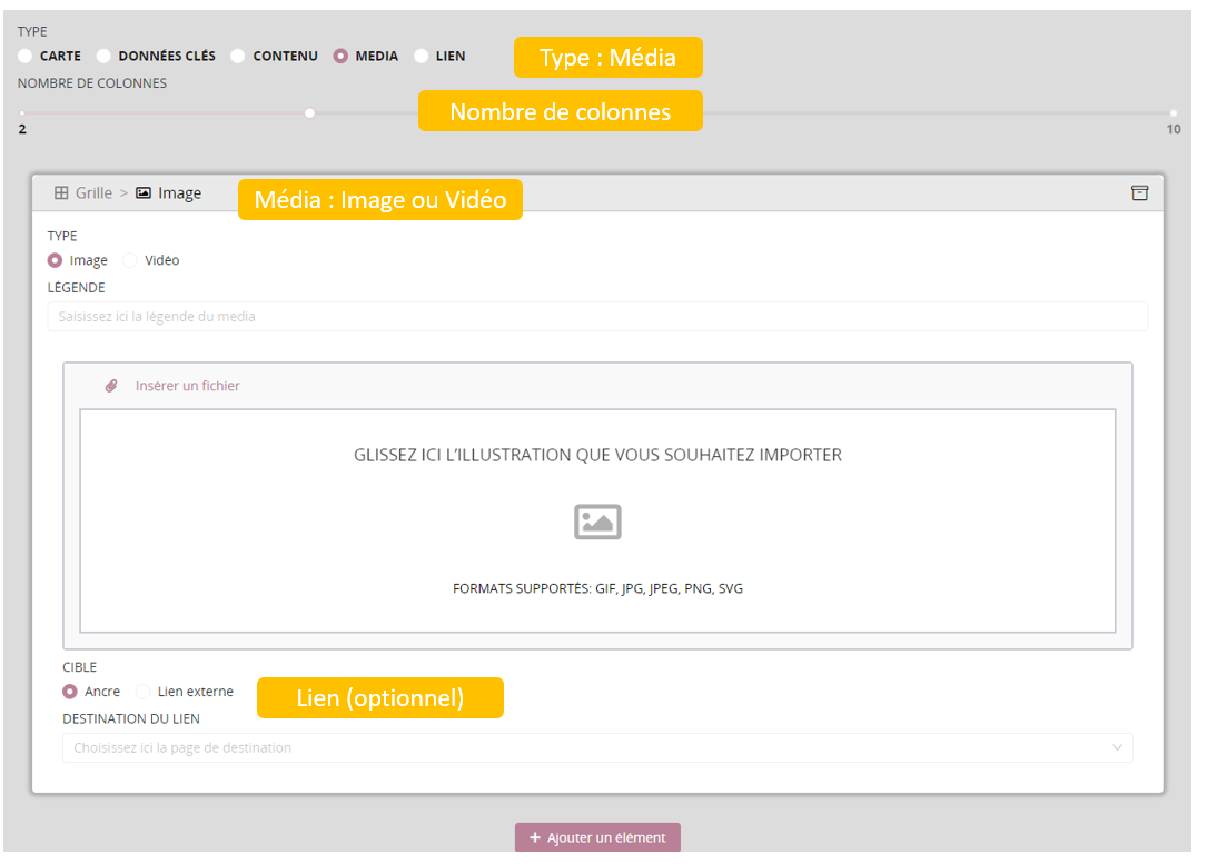 - Cliquez sur 'Ajouter un élément' pour ajouter un deuxième média et ainsi de suite