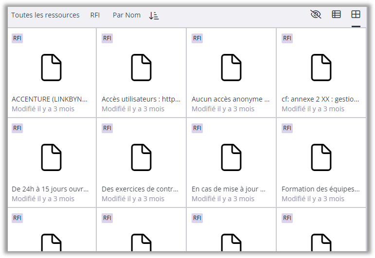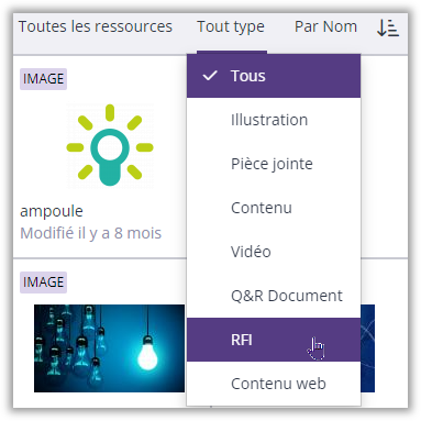 - Dans les filtres en haut de page, sélectionnez le filtre 'RFI’ pour visualiser uniquement les contenus capitalisés depuis un questionnaire excel.