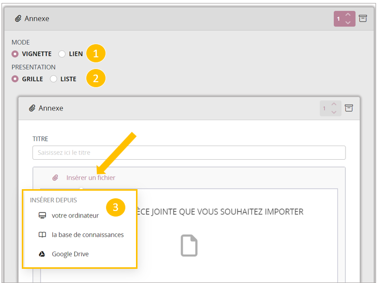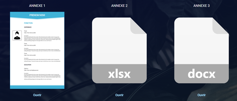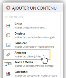 C'est un composant (conteneur) qui est utilisé seul via le composant Annexes, cela vous permet d'intégrer des éléments à télécharger tel qu'un PDF, un Excel, un Word, un Powerpoint. Ces éléments seront téléchargeables en cliquant sur le lien 'Ouvrir'.