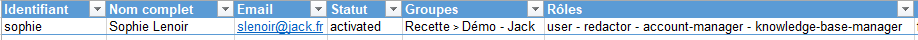 Dans l'exemple ci-dessus, le compte a les rôles User, Redactor, Account Manager et Knowledge Base Manager. Ces rôles sont valables pour les groupes Jack et Démo, sous-groupe du groupe Recette.