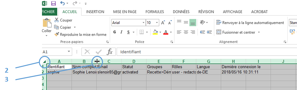 À la fin du téléchargement, ouvrez le fichier avec votre logiciel tableur habituel (généralement Microsoft Excel), puis suivez les étapes ci-dessous :