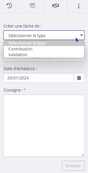 - Validation : si le travail attendu est une validation du contenu envoyé. Le validateur peut également modifier le contenu assigné.