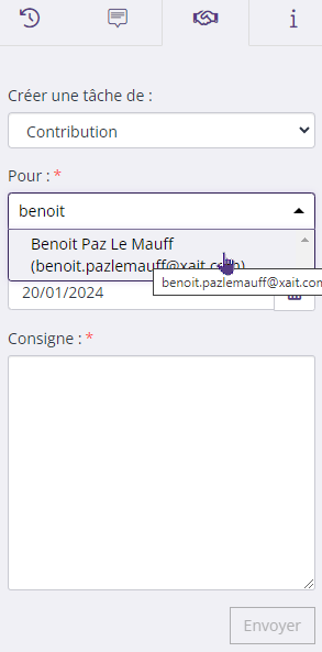 - Si le contributeur a un compte dans XaitProposal, son nom vous sera proposé.