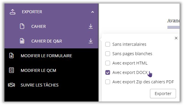 - Cliquez sur le type de cahier que vous souhaitez exporter : Cahier de Q&R