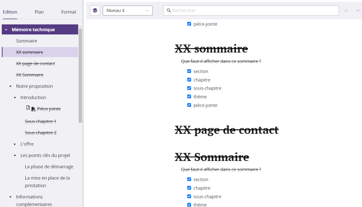 3. Les éléments archivés s'affichent en rayé, dans le plan de gauche et dans le traitement de texte.